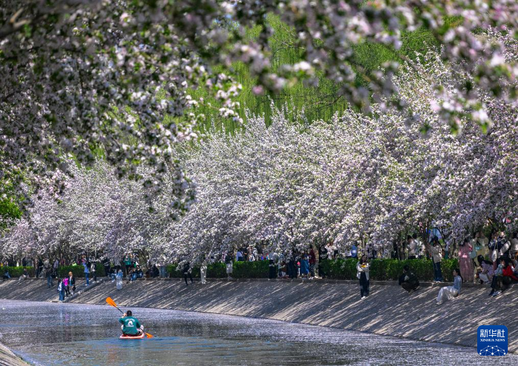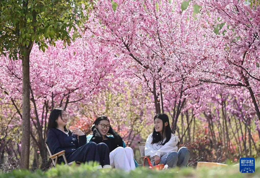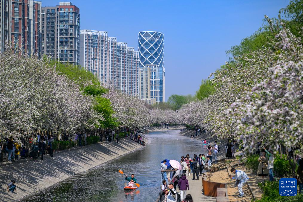 4月6日,人们在北京望京海棠花溪畔休闲。