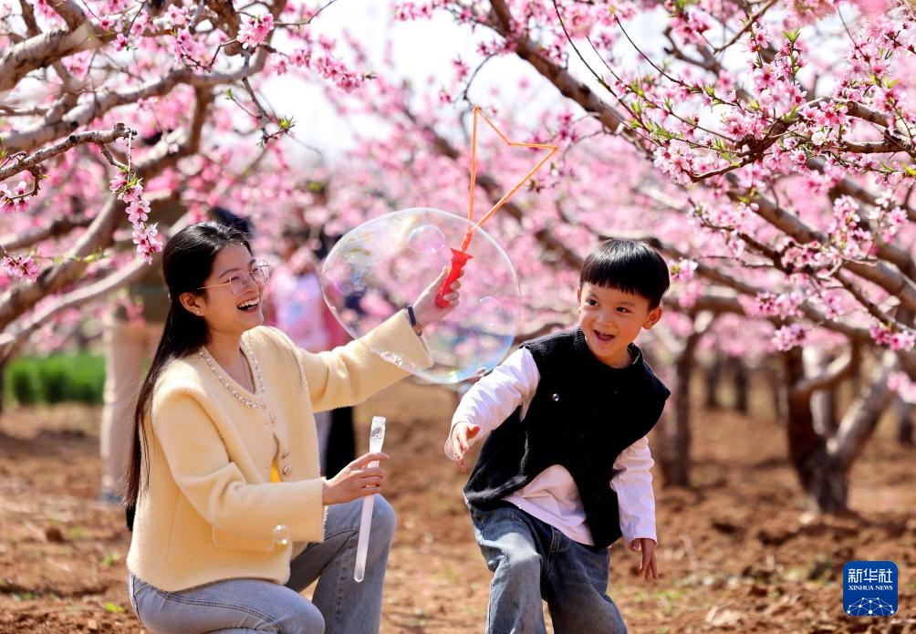4月6日,家长带着小朋友在山东省枣庄市市中区孟庄镇桃花园玩耍。