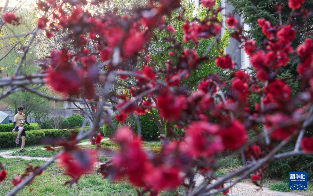4月6日,市民在北京市海淀区的一个花园运动。