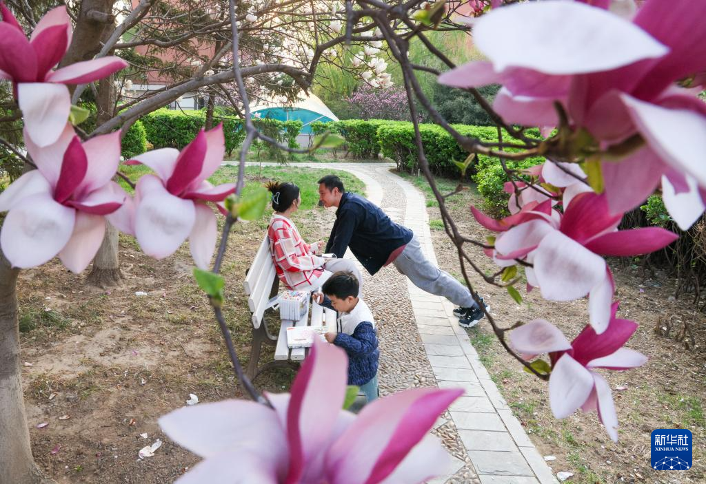 4月6日,家长带着孩子在北京市海淀区的一个花园休闲。