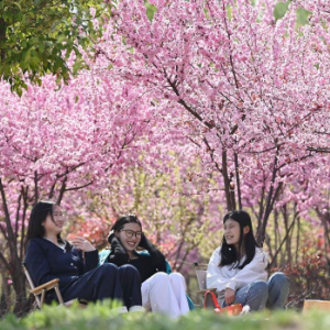 4月5日,游客在四川省南充市蓬安县相如湖国家湿地公园赏花游玩。