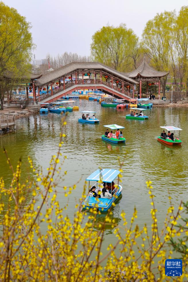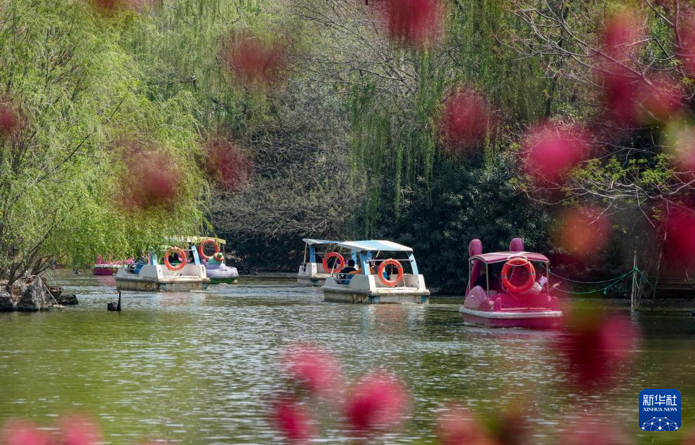 4月6日,游客在位于兰州市安宁区的仁寿山公园内泛舟赏景。