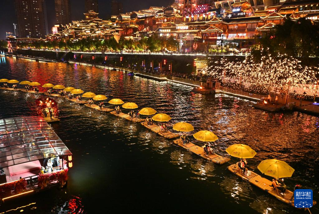4月5日,游客乘坐“龙游贡水”竹筏在湖北省恩施土家族苗族自治州宣恩县城贡水河上赏夜景。