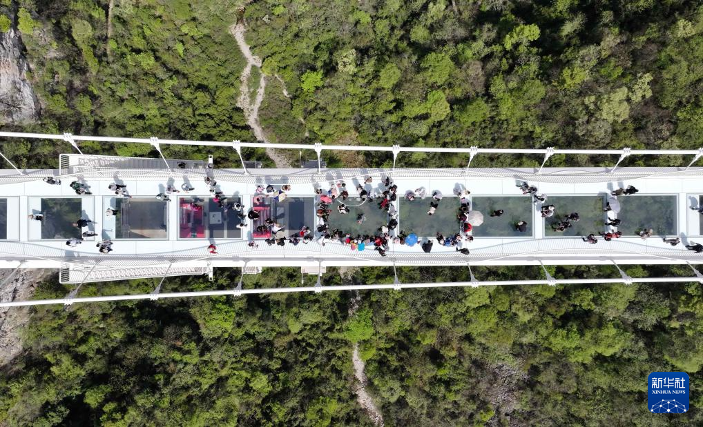 4月6日,游客在湖南省张家界大峡谷玻璃桥上游览(无人机照片)。