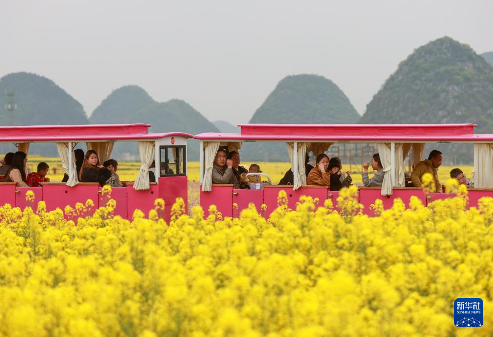 4月6日,在贵州省安顺市平坝区白云镇平元村,游客乘坐观光小火车在油菜花海中赏花游览。