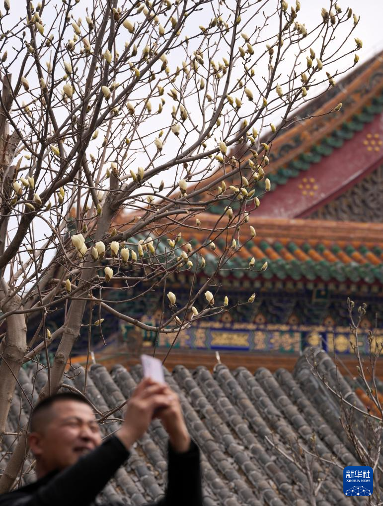 4月6日,游人在沈阳故宫拍摄含苞待放的玉兰花。