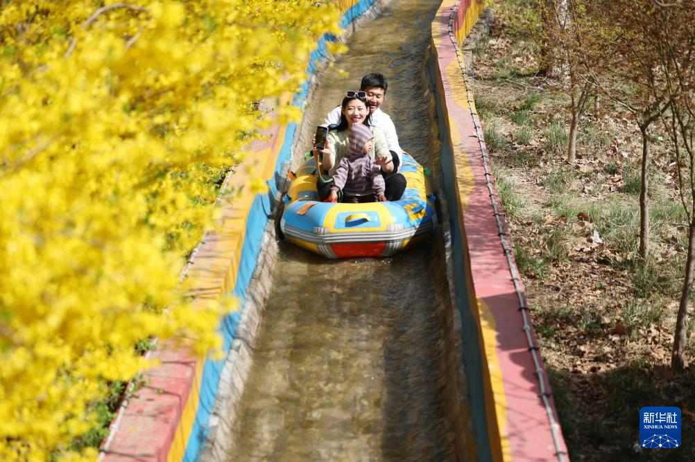 4月6日,游客在山东省临沂市沂南县铜井镇竹泉村体验漂流。