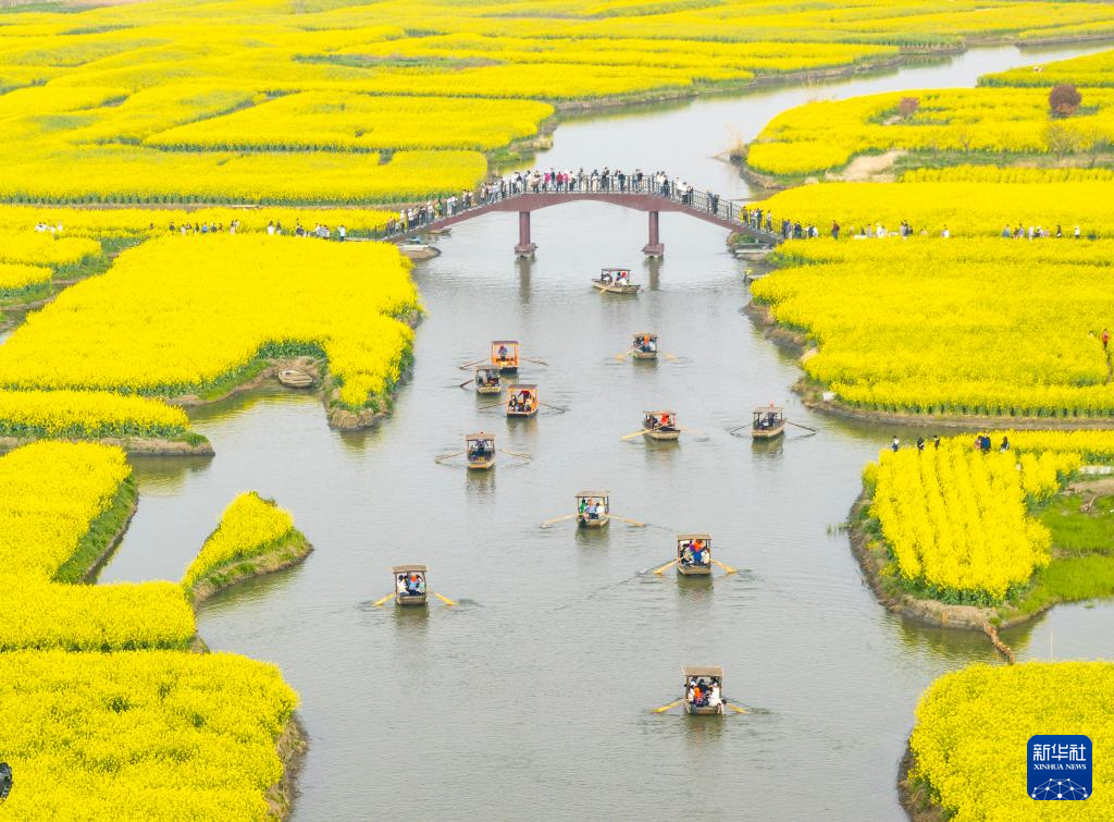 4月5日,游客在江苏省兴化市千垛景区赏花游玩(无人机照片)。