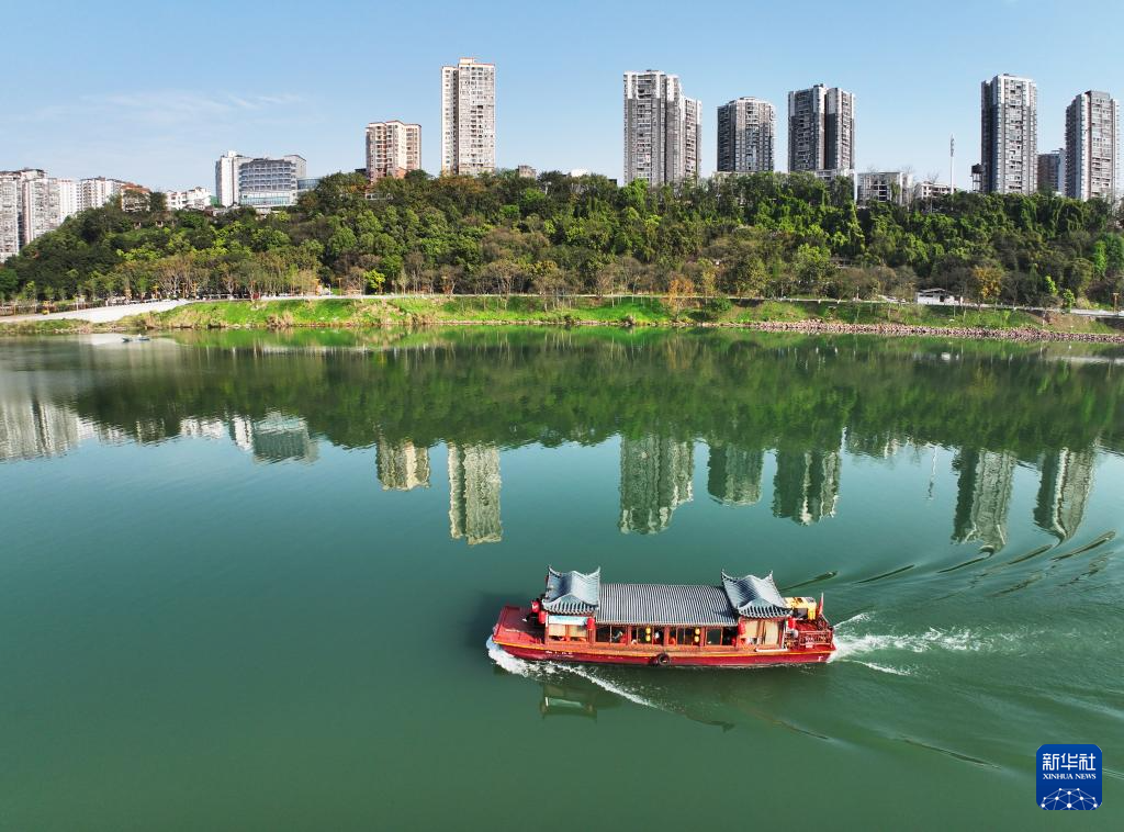 4月6日,游客在四川省广安市武胜县嘉陵江龙女湖乘坐画舫游览(无人机照片)。