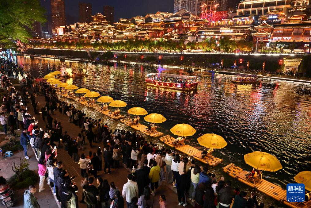 4月4日晚,游客在湖北省宣恩县城贡水河畔赏景游玩。