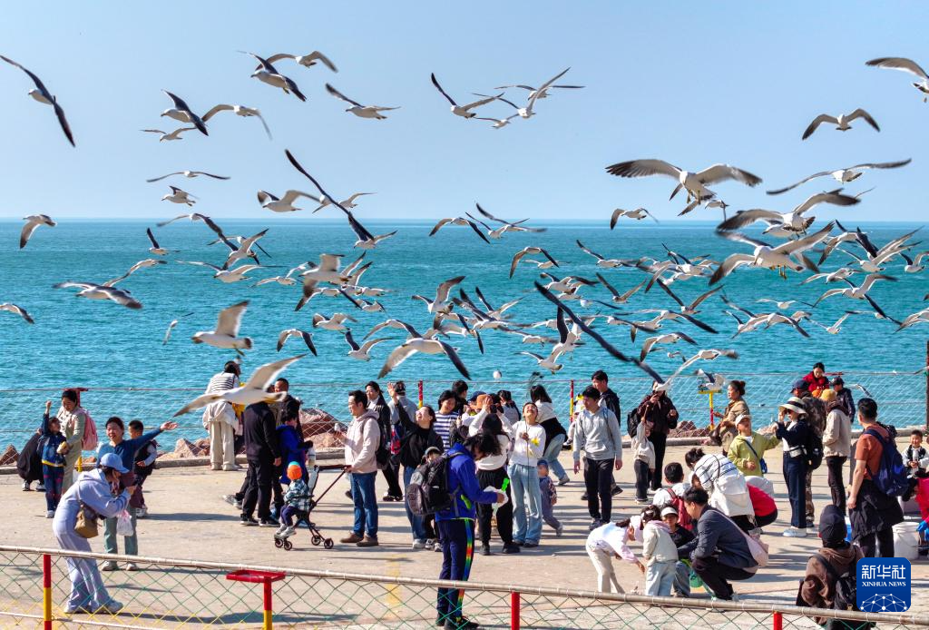 4月6日,在山东省荣成市西霞口神雕山野生动物世界滨海步道,游客与黑尾鸥亲密互动(无人机照片)。