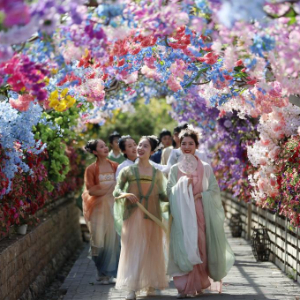 4月6日,在山东省郯城县醉东风乡村艺栈,身着传统服饰的演员为游客表演。