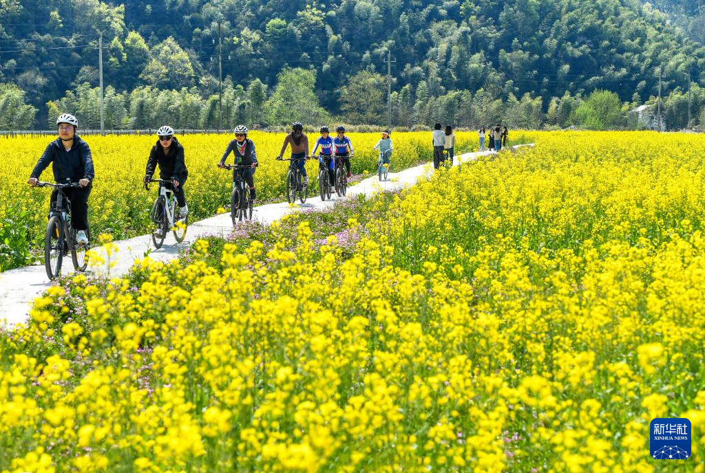 4月3日,骑行爱好者在江西省宜春市铜鼓县高桥乡胆坑村油菜花海中骑行。