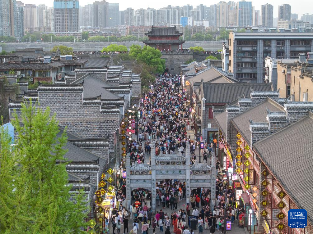 4月5日,游客在湖北省襄阳古城北街游览(无人机照片)。