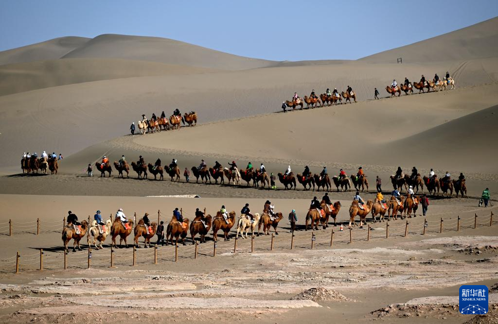 4月5日,游客在甘肃省敦煌市鸣沙山月牙泉景区游览。