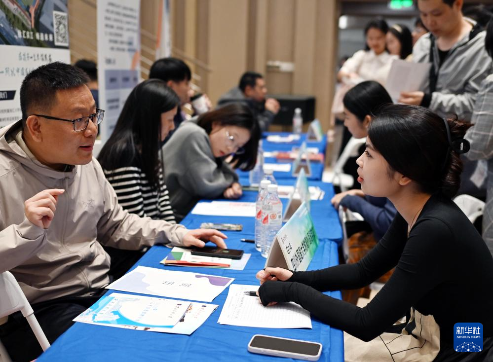 4月8日,求职者与用人单位代表交流。