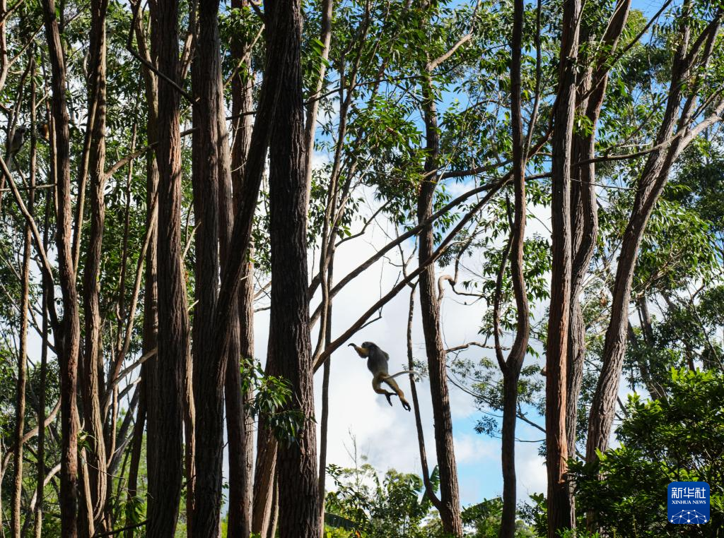 3月29日,在马达加斯加安达西贝私人保护区,一只狐猴飞跃在树林中。