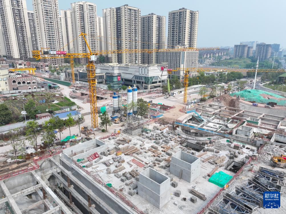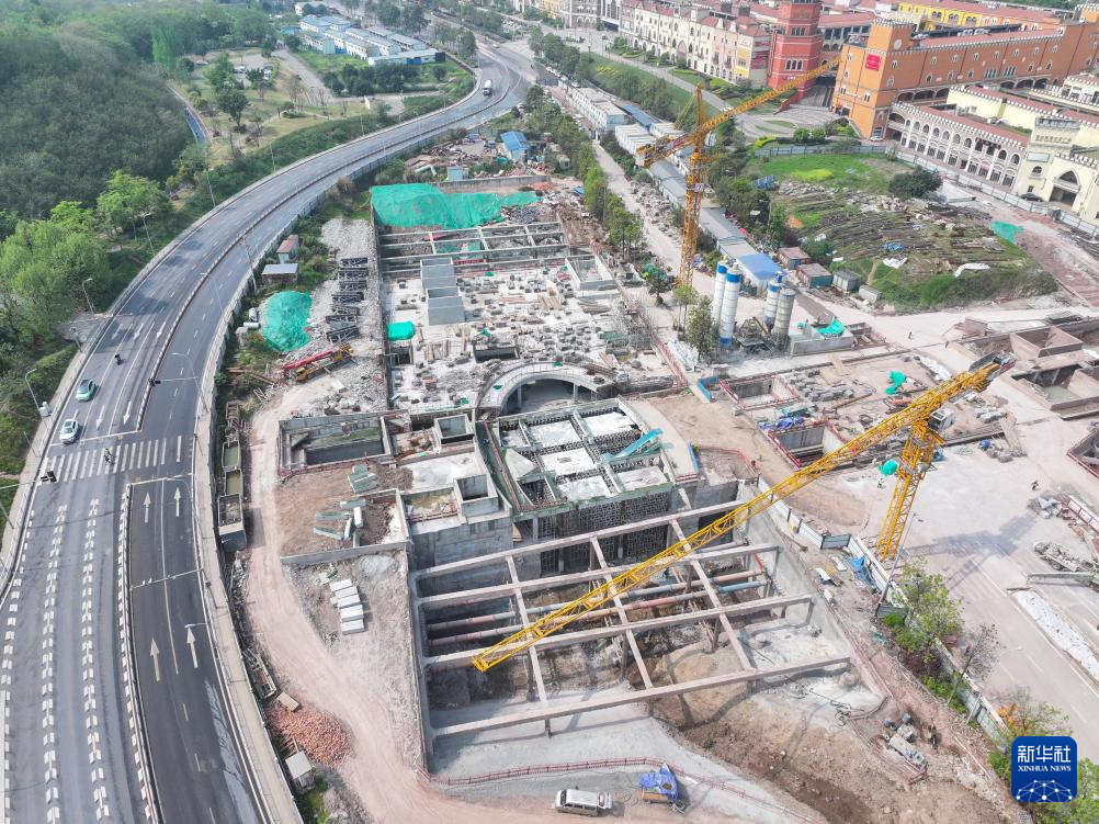 4月8日拍摄的重庆轨道交通24号线鹿角北站施工作业现场(无人机照片)。