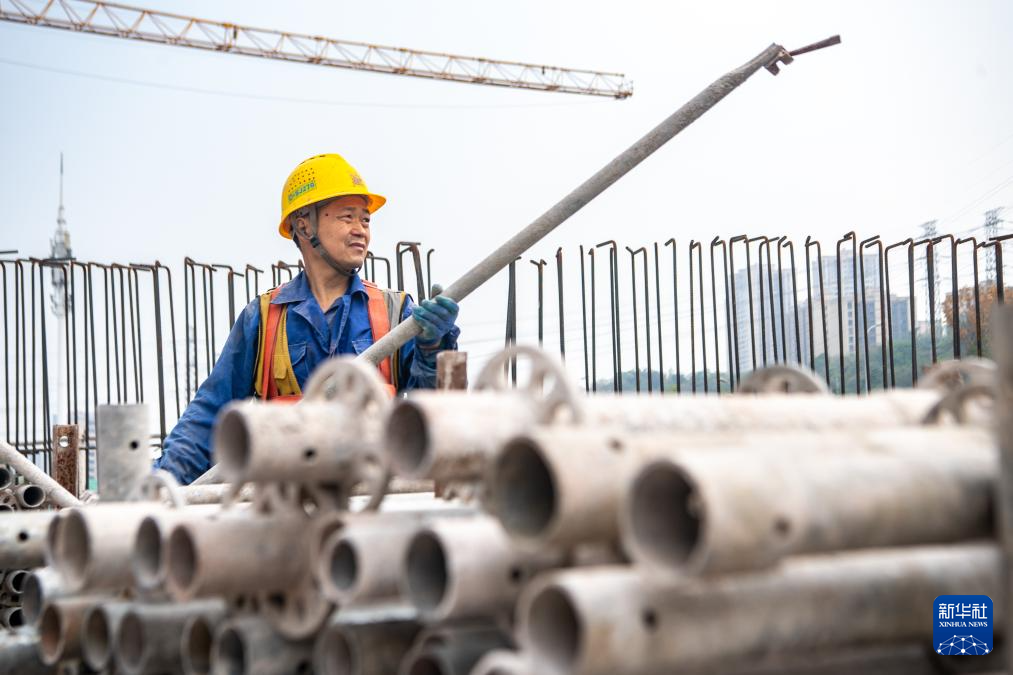 4月8日,工人在重庆轨道交通24号线鹿角北站建设现场作业。