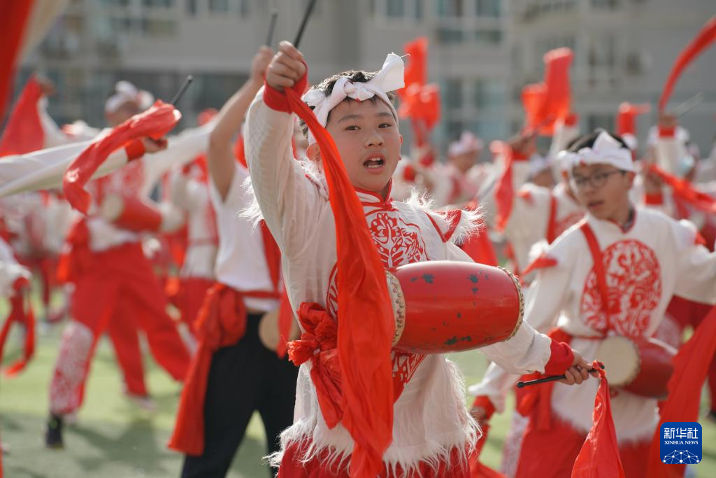 4月8日,西安辅轮中学学生在阳光体育大课间30分钟练习腰鼓。