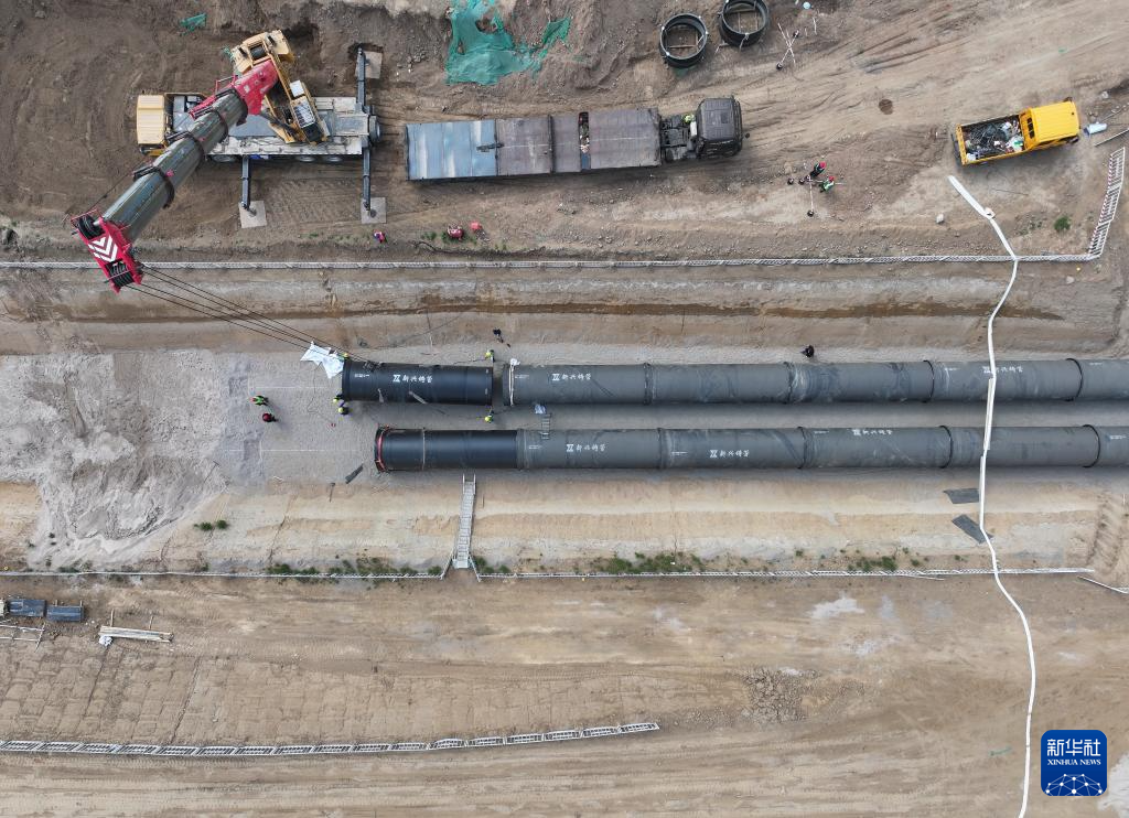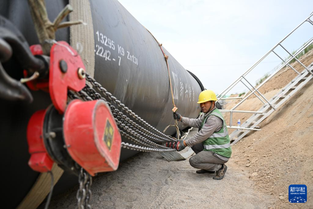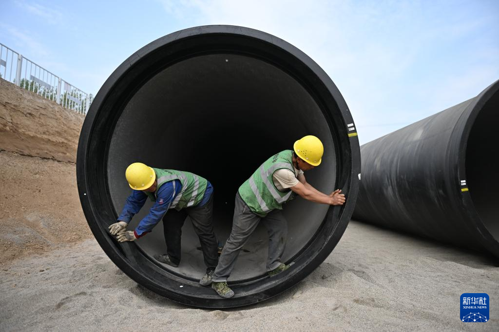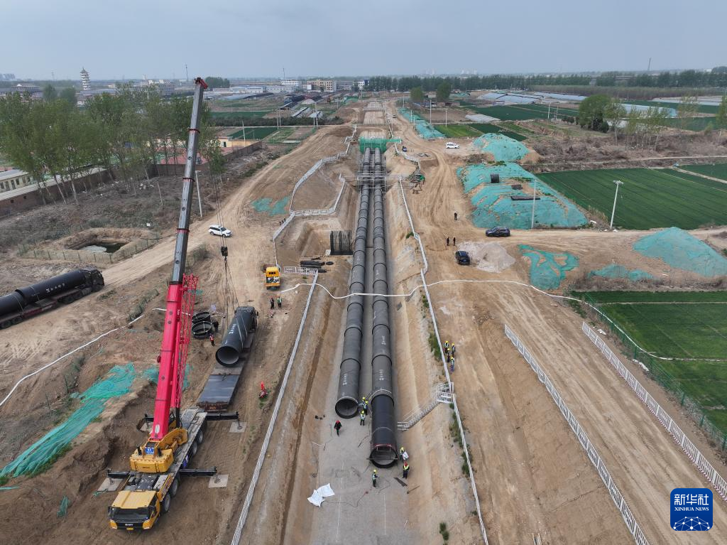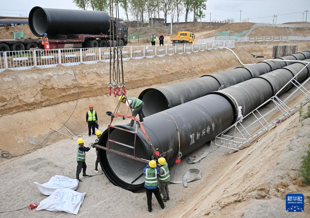 4月9日,中铁十二局工人在雄安干渠工程二标段建设现场安装输水管道。