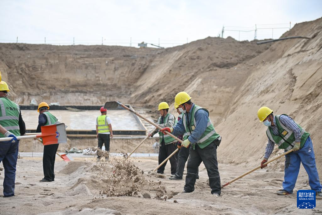 中铁十二局工人在雄安干渠工程二标段建设现场施工(4月9日摄,无人机照片)。