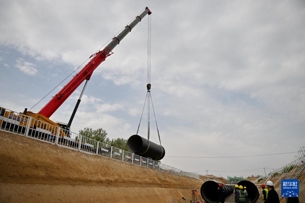 4月9日,吊车在雄安干渠工程二标段建设现场吊装输水管道。
