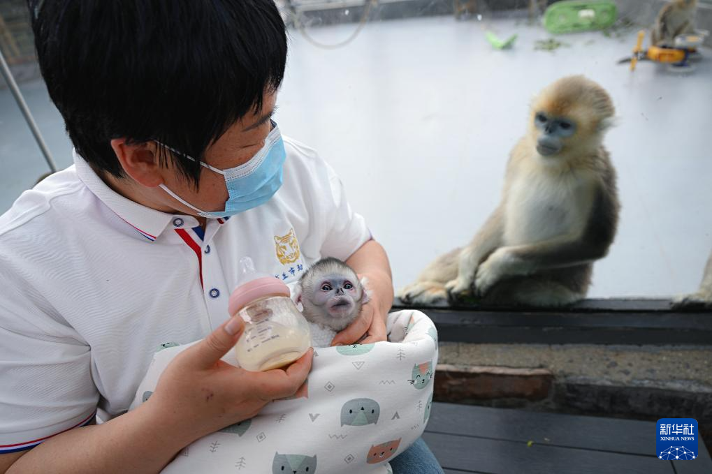 4月8日,工作人员在河南省商丘动物园给川金丝猴幼崽喂奶。
