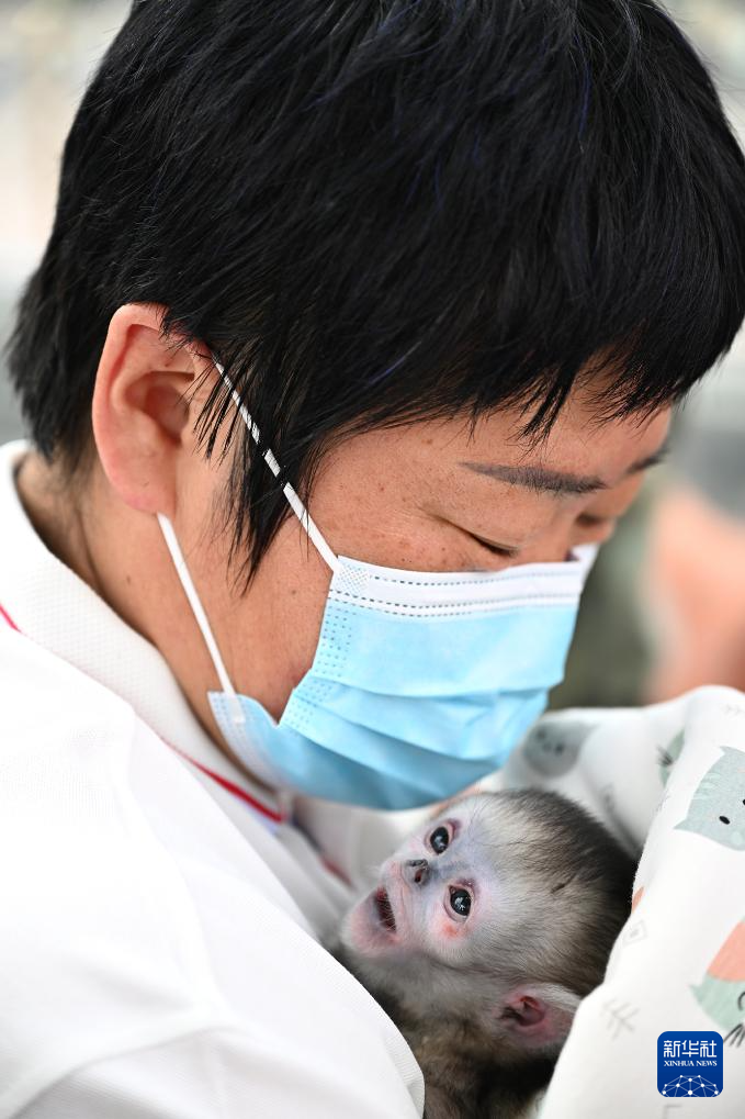 4月8日,在河南省商丘动物园,工作人员在给川金丝猴幼崽喂奶后拍背。