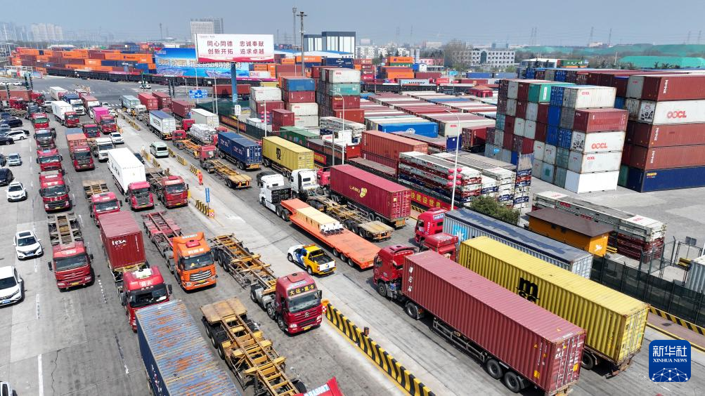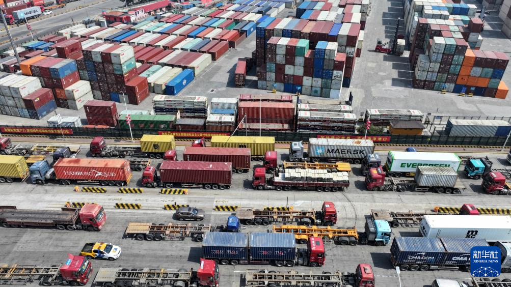 4月10日,在山东港口青岛港前湾集装箱码头,集装箱运输车辆排队进行装卸作业(无人机照片)。