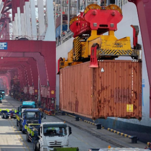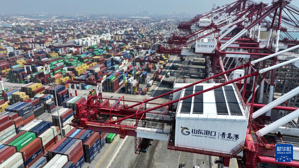 4月10日,一艘集装箱货轮在山东港口青岛港前湾集装箱码头进行装卸作业(无人机照片)。