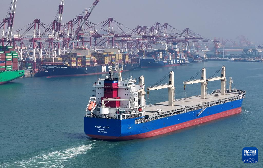 4月10日,货轮驶出山东港口青岛港前湾集装箱码头(无人机照片)。