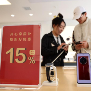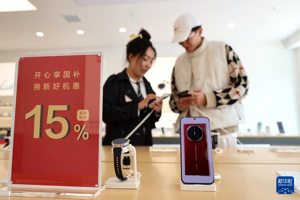 4月10日,消费者在山东省滨州市一家手机商店内选购手机。
