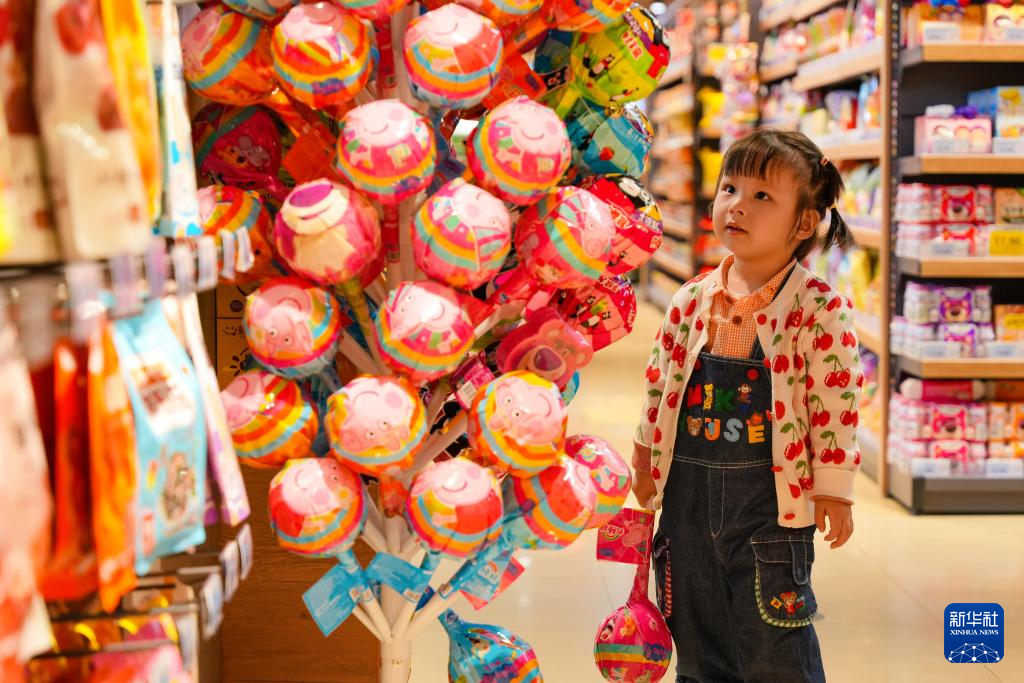 4月10日,小朋友在黑龙江省大兴安岭地区一家超市选购商品。