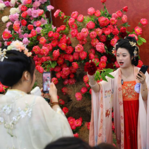 4月10日,工作人员身着传统服饰进行花卉销售网络直播。
