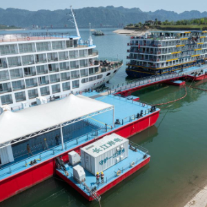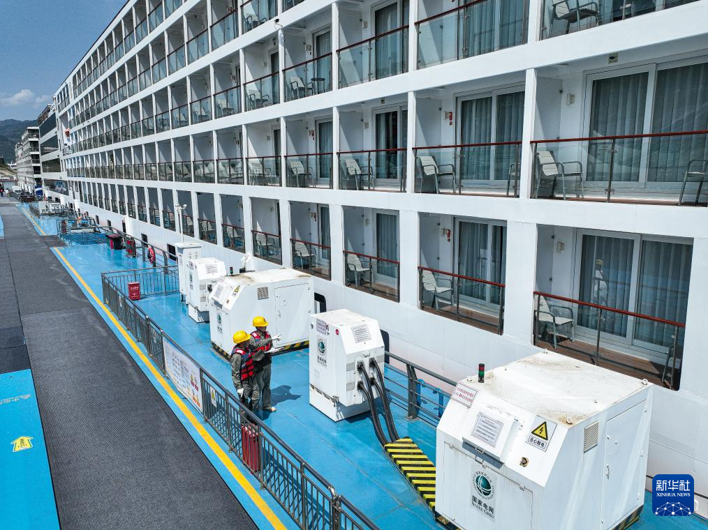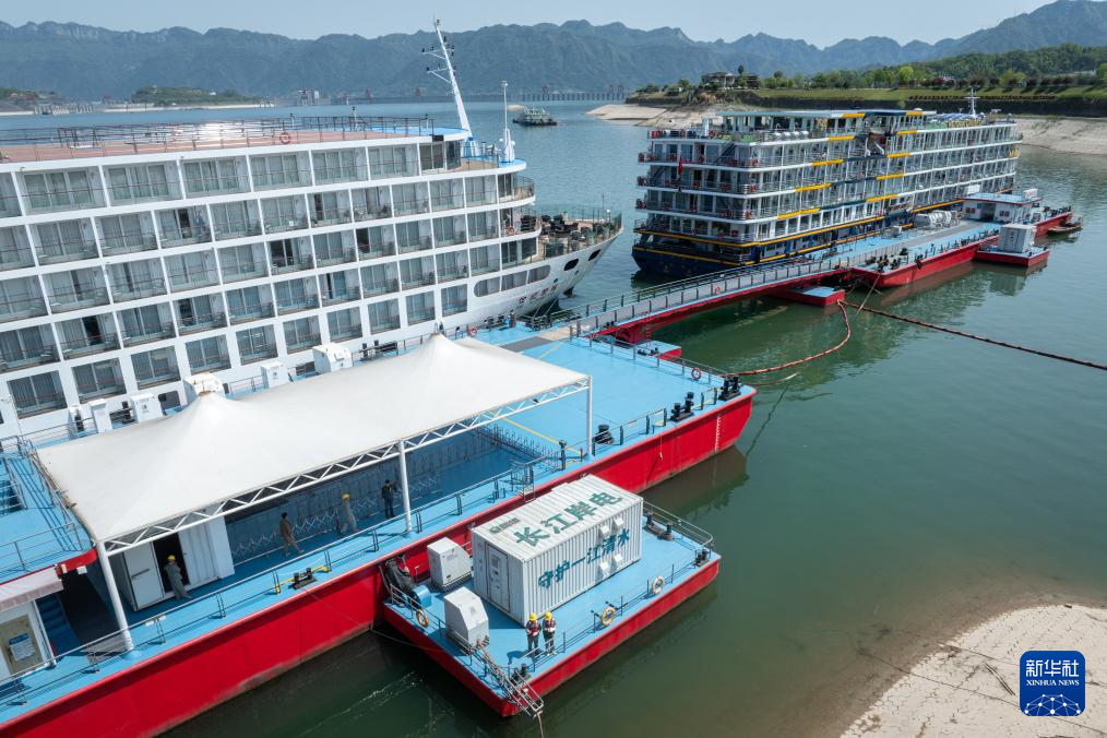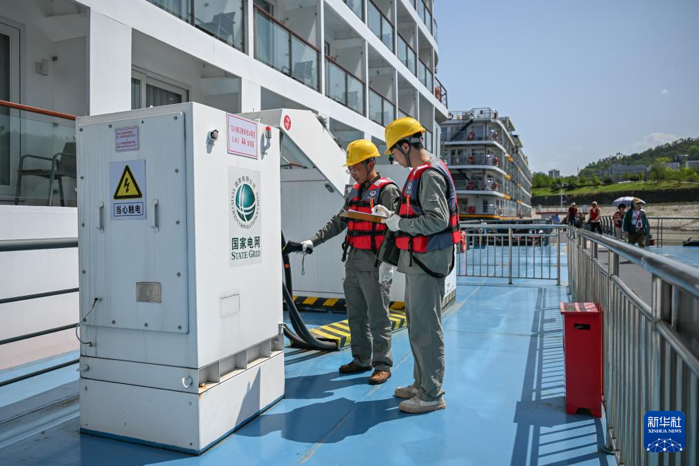 4月10日,国网宜昌供电公司岸电运维人员在湖北秭归港为邮轮接用岸电。