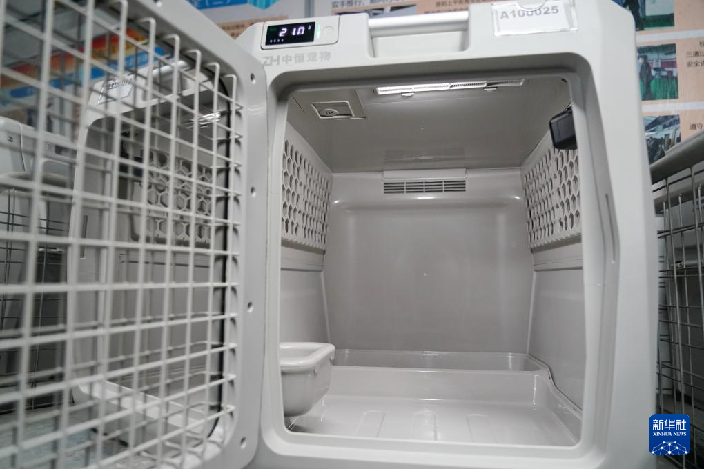 这是4月10日拍摄的高铁专用宠物运输箱,箱子自带空气循环系统、含氧量和温湿度监测及降噪、除味等功能。