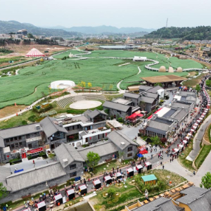4月11日,在四川省中江县觉慧村非遗大集现场,游客在欣赏非遗代表性项目展演(无人机照片)。