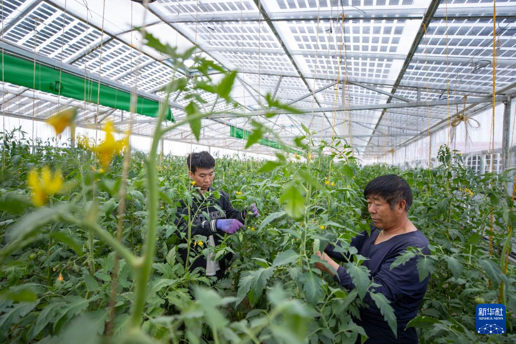 4月10日,当地农户在宁夏吴忠市红寺堡区柳泉乡永新村高效智能恒温节水光伏大棚内打理西红柿。