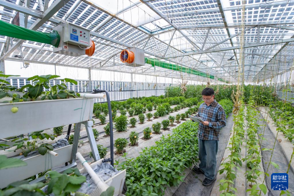 4月10日,科研人员在宁夏吴忠市红寺堡区柳泉乡永新村高效智能恒温节水光伏大棚内记录农作物生长情况。