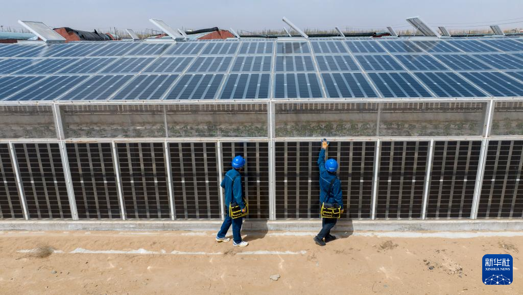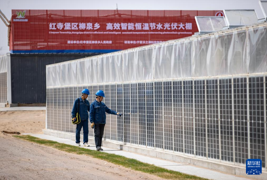 4月10日,当地供电部门工作人员在宁夏吴忠市红寺堡区柳泉乡永新村检查高效智能恒温节水光伏大棚的光伏板工作情况。