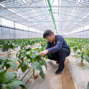 4月10日,当地农户在宁夏吴忠市红寺堡区柳泉乡永新村高效智能恒温节水光伏大棚内打理彩椒。