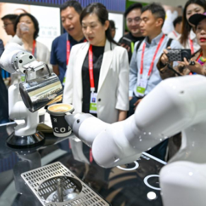 4月13日,观众在消博会现场观看一款拉花咖啡机器人。