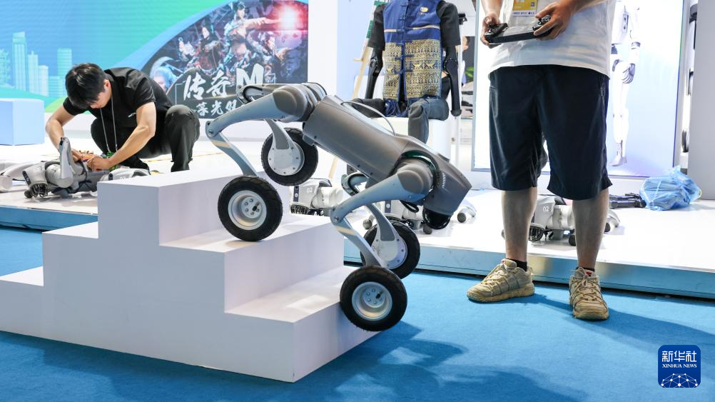 这是4月13日在第五届消博会现场拍摄的宇树科技展示的机器狗在上下台阶。