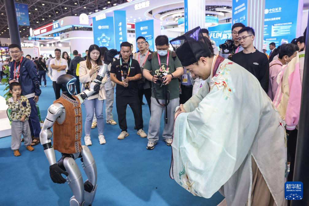 4月13日,身着古装的观众在第五届消博会上与宇树科技的人形机器人互动。