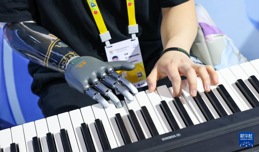 4月13日,在第五届消博会现场,参展商在展示用智能假肢弹琴。