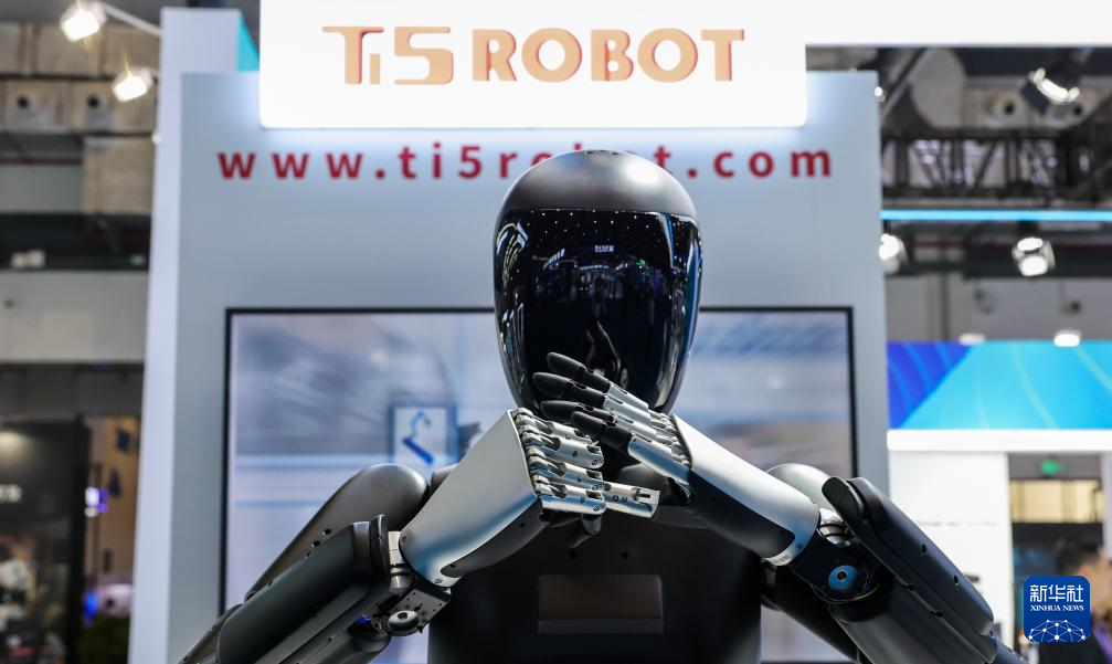 这是4月13日在第五届消博会现场拍摄的参展商展示的机器人。