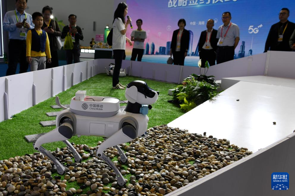 4月13日,在第五届中国国际消费品博览会中国移动展台,工作人员在演示机器狗模拟给户外活动的老年人送药的场景。