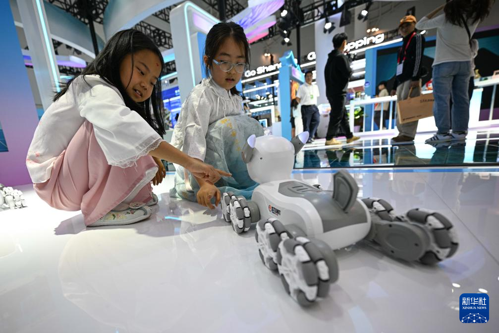 4月13日,在第五届消博会现场,小朋友和宇树科技展示的机器狗互动。