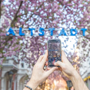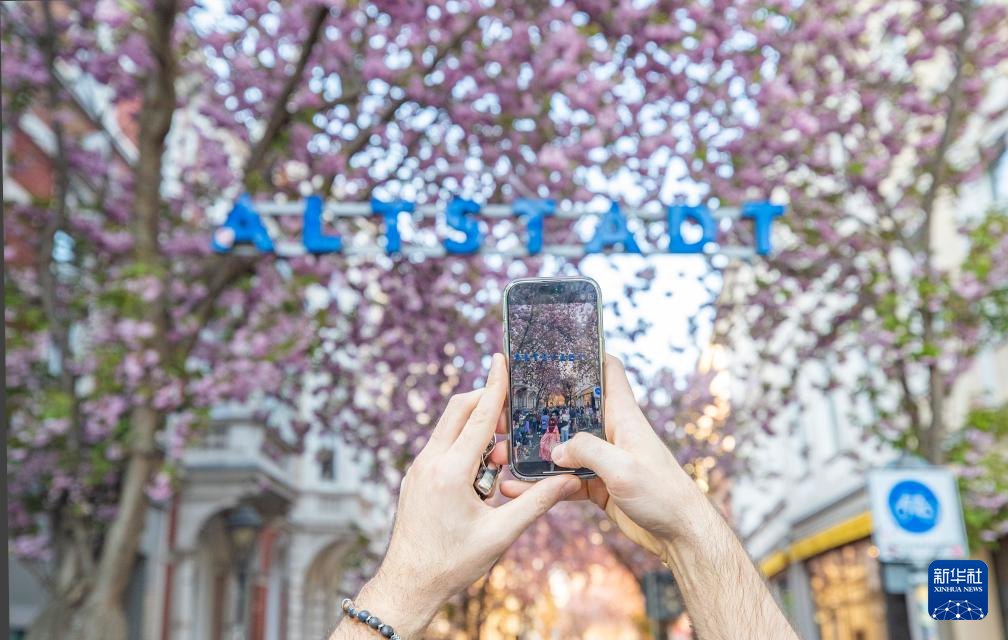 4月12日,游人在德国波恩拍摄盛开的樱花。